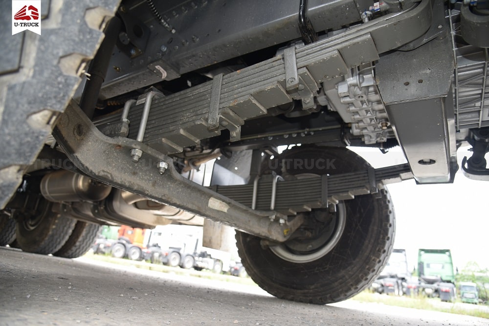 - Cầu trước của xe là loại nhíp bó 11 lá, có giảm chấn thủy lực và thanh cân bằng.