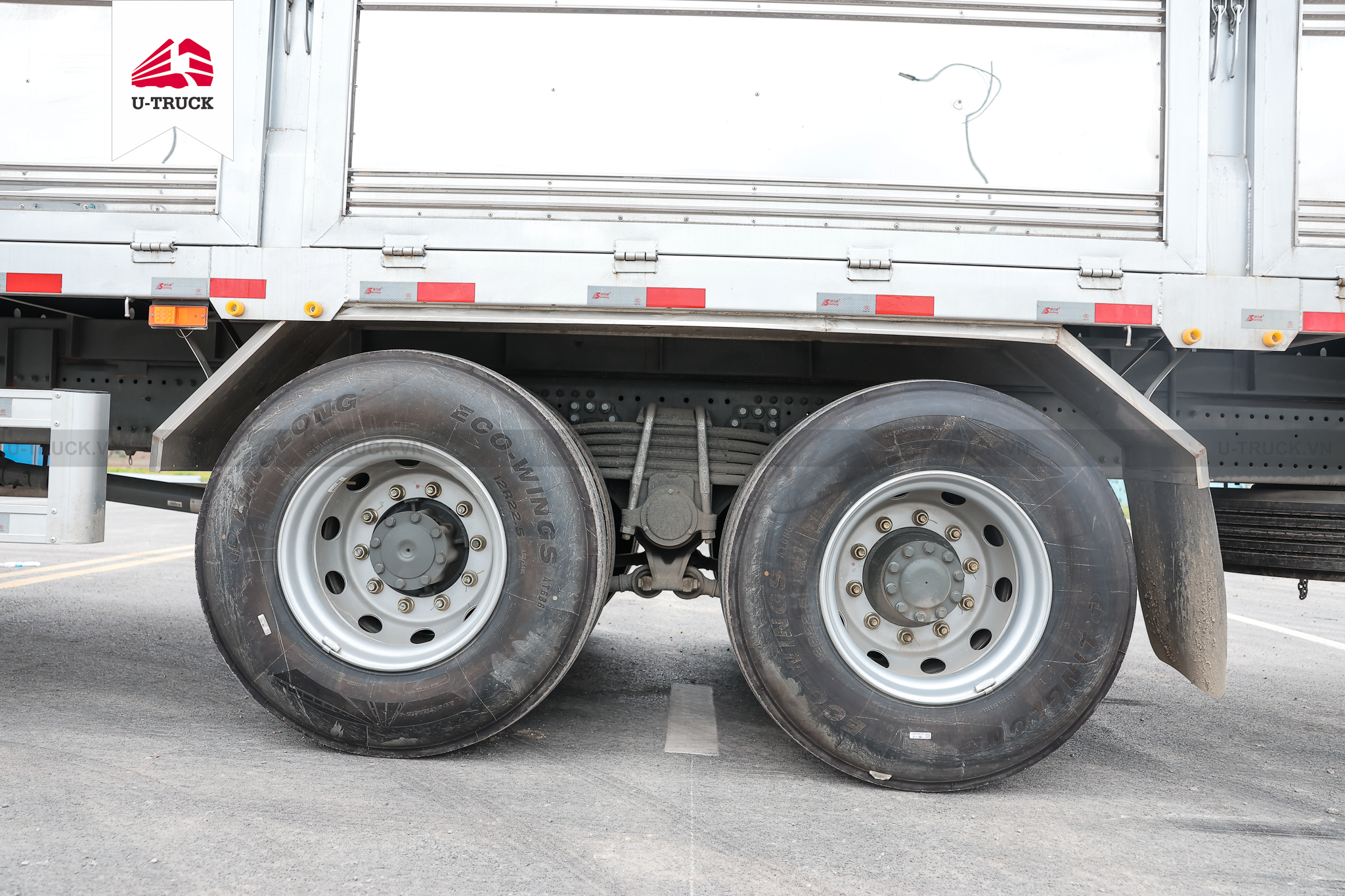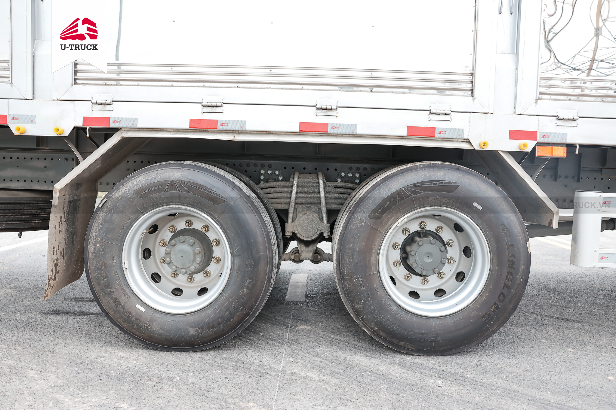 - Hệ thống treo: Phía trước là loại Phụ thuộc, nhíp lá, giảm chấn thủy lực, kết hợp với phía sau là loại Phụ thuộc, nhíp lá, đảm bảo khả năng chịu tải tốt và độ ổn định cao khi xe chở nặng.