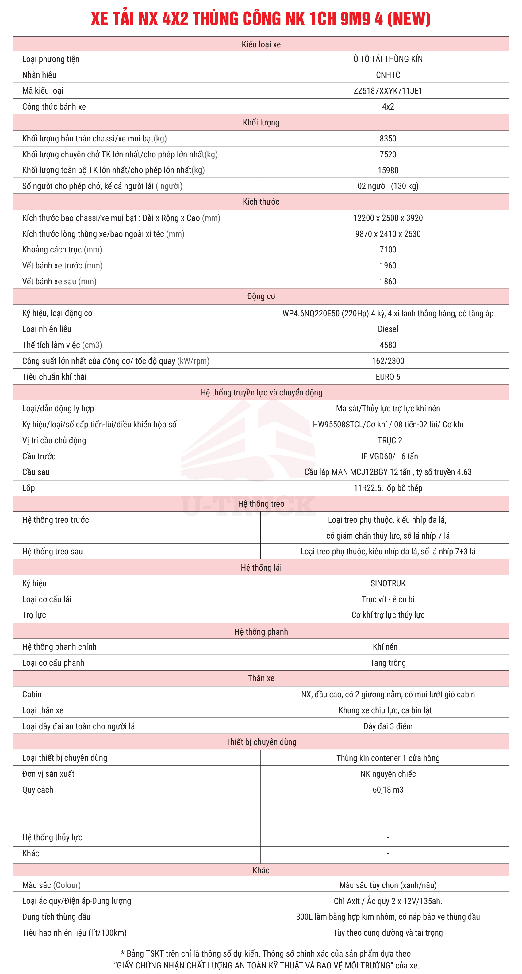 Xe tải NX 4X2 thùng Công 1 cửa hông nhập khẩu 9M9 đáp ứng phân khúc chở tải 6-9 tấn, phục vụ trung chuyển hàng hóa giữa các tỉnh, trung chuyển hàng giữa các khu công nghiệp, cụm công nghiệp, xe vận tải chạy đường dài, đường trường, đường hỗn hợp, vận tải logistic, chuyển phát nhanh, xe thư báo…với các loại hàng hóa như nông sản, bánh kẹo, hàng điện tử, hàng may mặc…