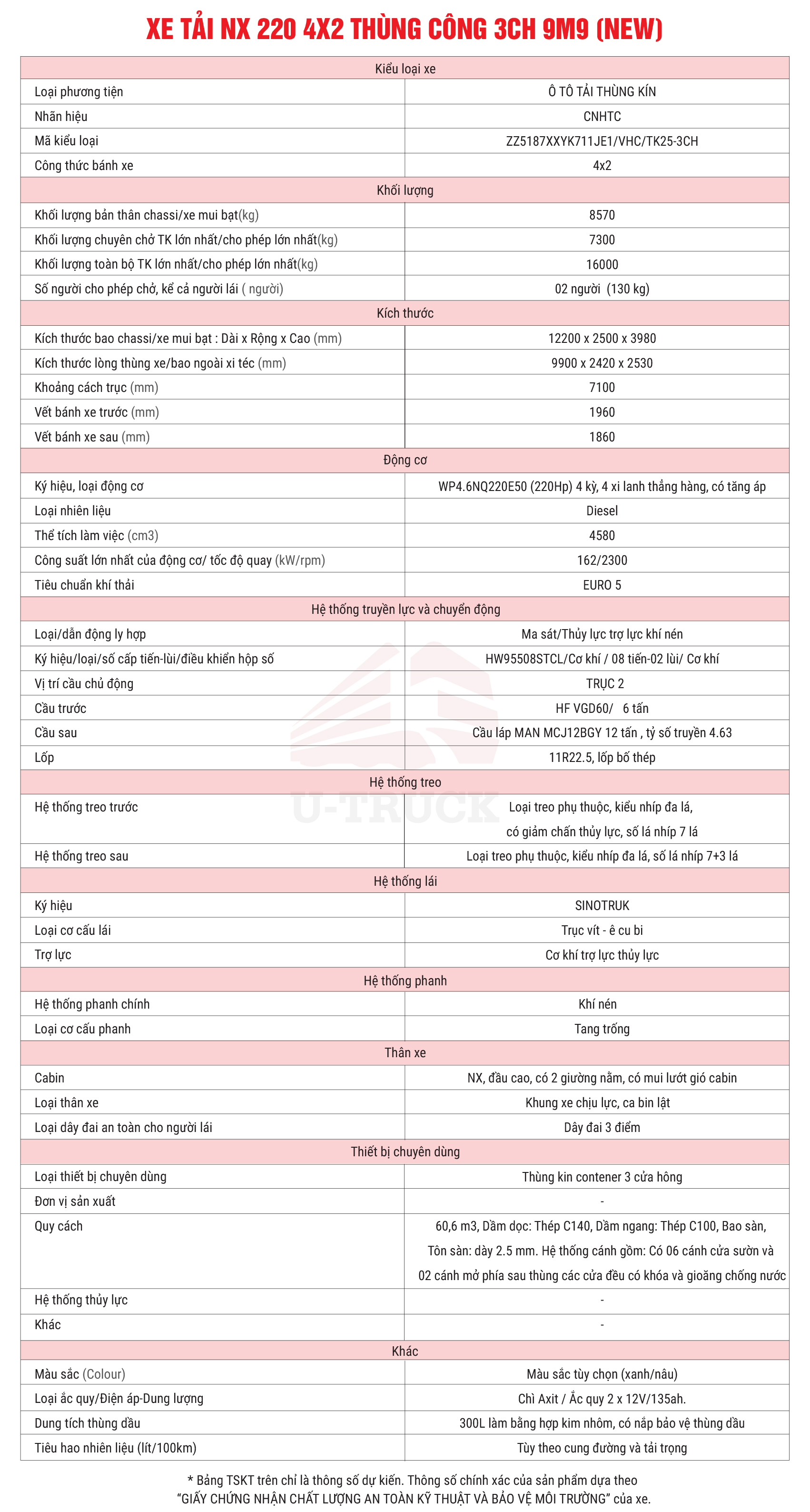 Xe tải NX 4X2 thùng Công 3 cửa hông 9M9 đáp ứng phân khúc chở tải 6-9 tấn, phục vụ trung chuyển hàng hóa giữa các tỉnh, trung chuyển hàng giữa các khu công nghiệp, cụm công nghiệp, xe vận tải chạy đường dài, đường trường, đường hỗn hợp, vận tải logistic, chuyển phát nhanh, xe thư báo…với các loại hàng hóa như nông sản, bánh kẹo, hàng điện tử, hàng may mặc…